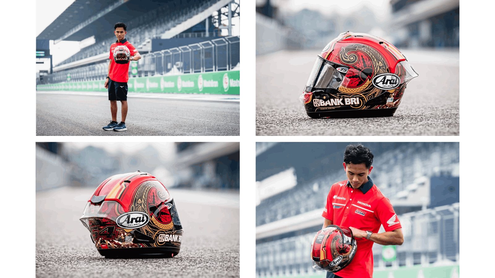 Mario bahkan membawa misi geospasial ini secara harfiah: di musim 2026, ia tampil dengan helm bertema Jawa Timur Gerbang Baru Nusantara yang menampilkan motif Batik Bumi Mageti dan simbol Surya Majapahit. Sebuah kota kecil di kaki Gunung Lawu, hadir di depan jutaan penonton global. Geografi bukan lagi batas, ia menjadi identitas.